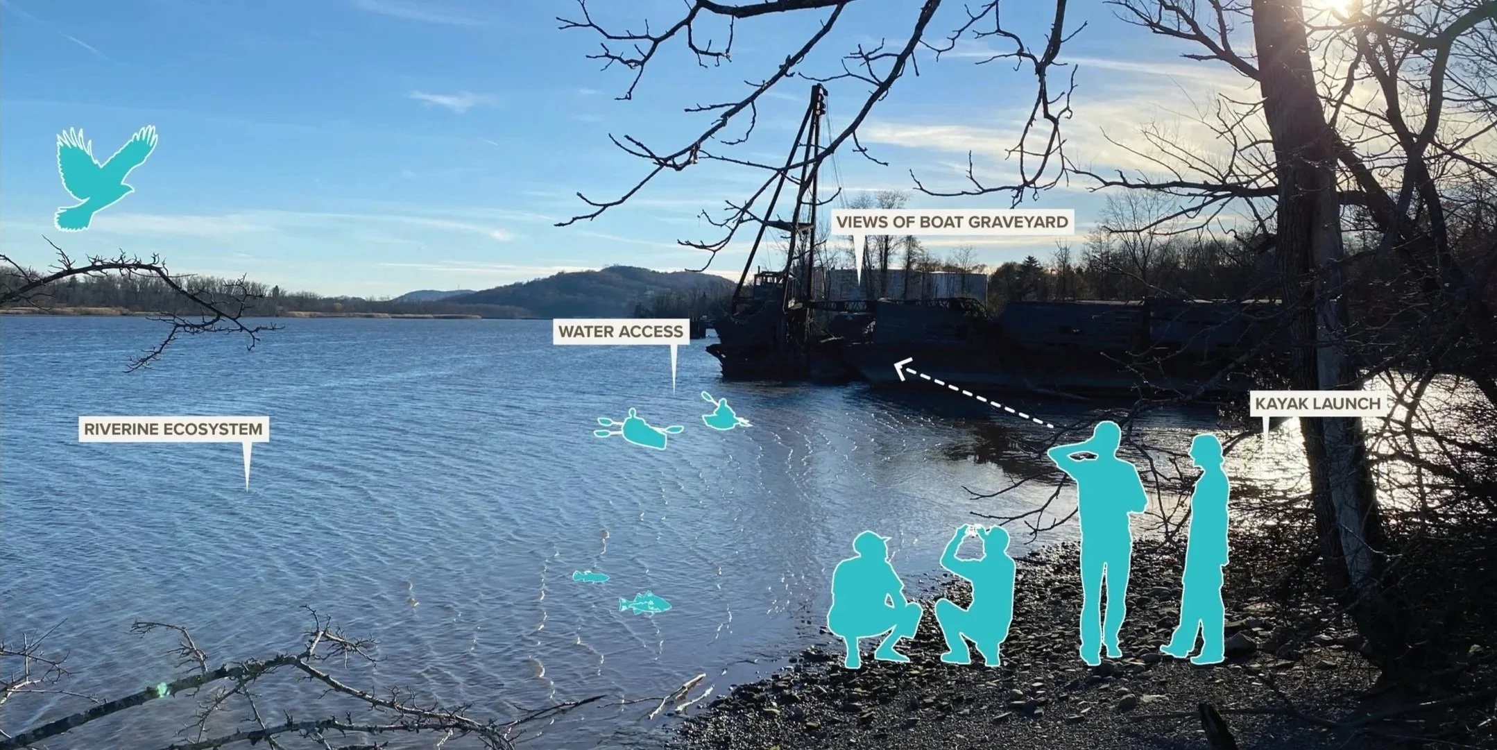 Assemblage teamed with urban designer Kaja Kuehl of youarethecity to develop a phased site design for a Living Museum located on the Hudson River. The former industrial warehouse on the site will become a public resource for contemporary and historic boats, education, and ecology. With the support of a Hudson Valley River Greenway grant, we envisioned a new future for a waterfront parcel that will generate local momentum to create a center for maritime and riverine boat education in Athens. The design draws from the existing forest marsh to highlight local ecology and proposes new features to activate new access to the Hudson River.