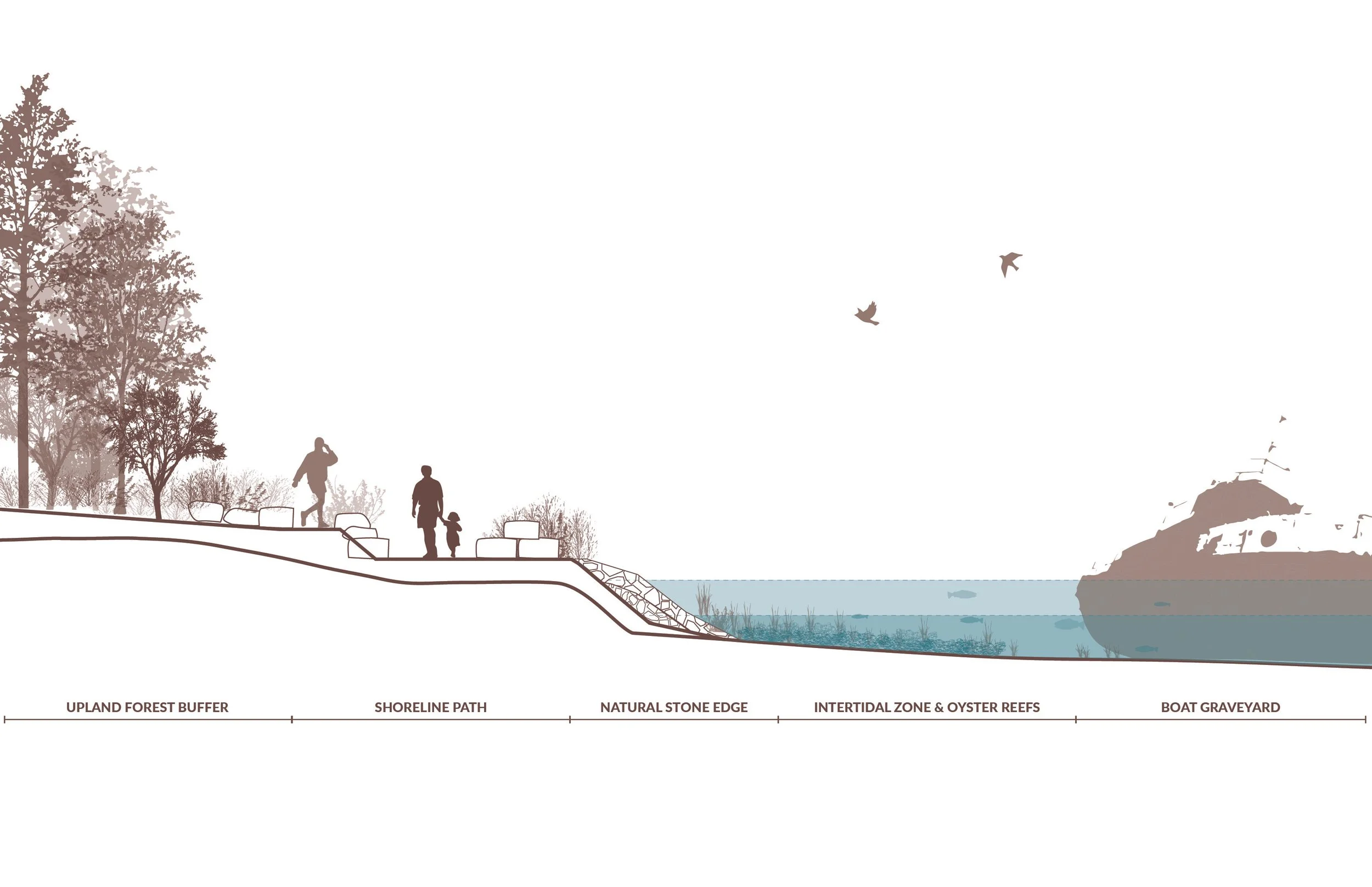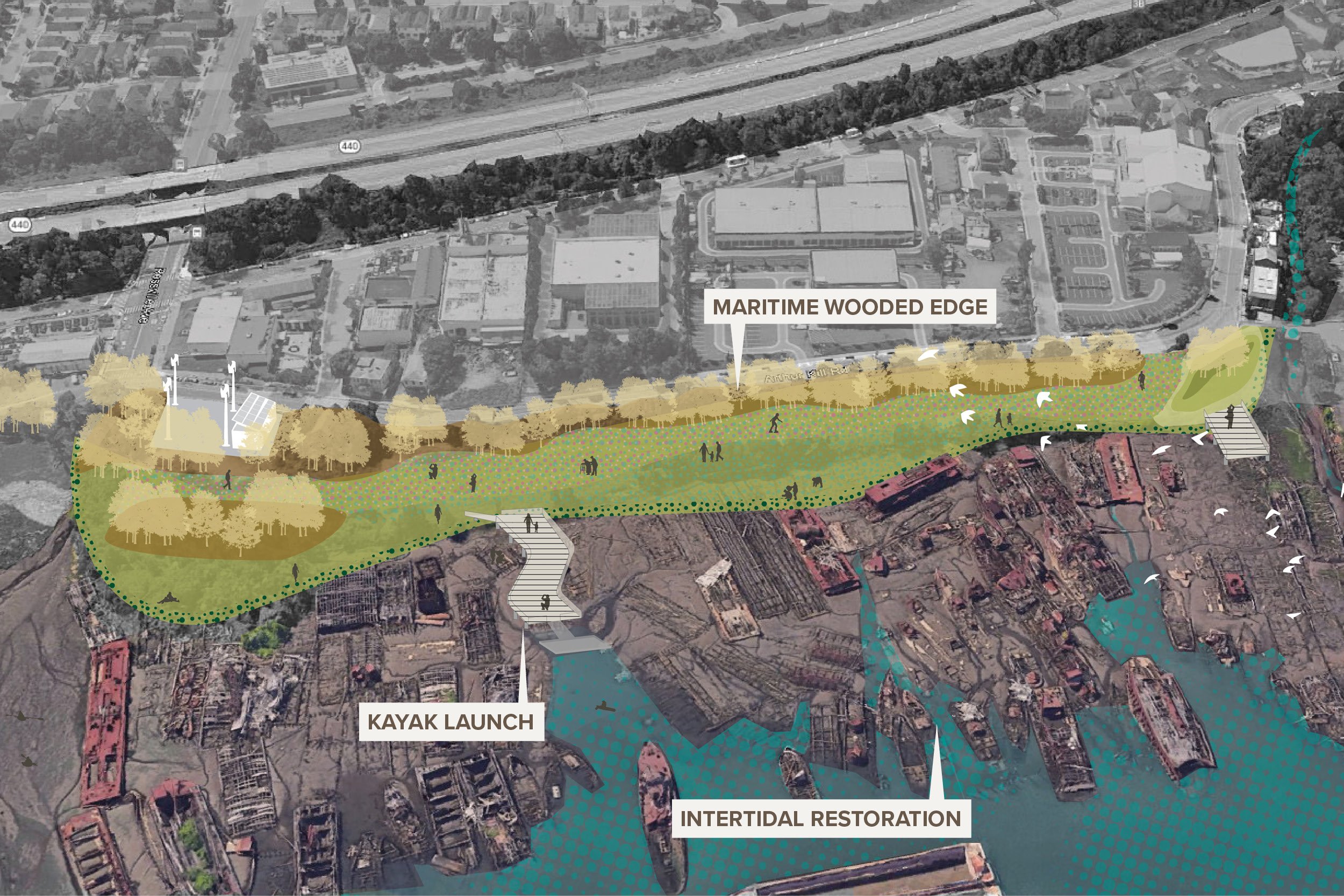 A new waterfront park paired with the existing ghost boat graveyard expands the recreational capacity of the waterfront for the adjacent community.