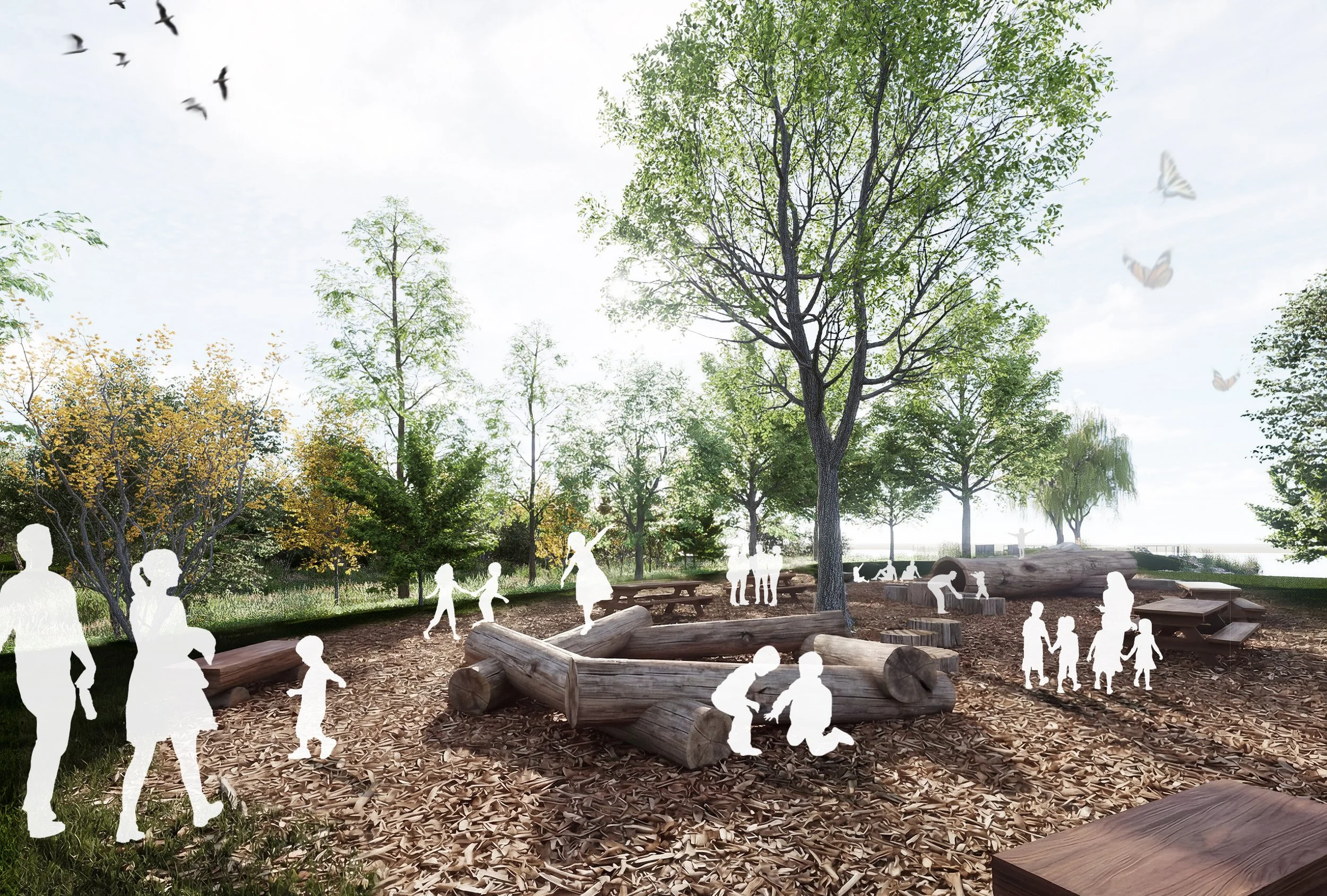 Our climate-adaptive approach repurposes existing materials. Existing trees have a second life as play features within the natural play area. We consider the full material potential of every site by integrating salvage and reuse into the design process.