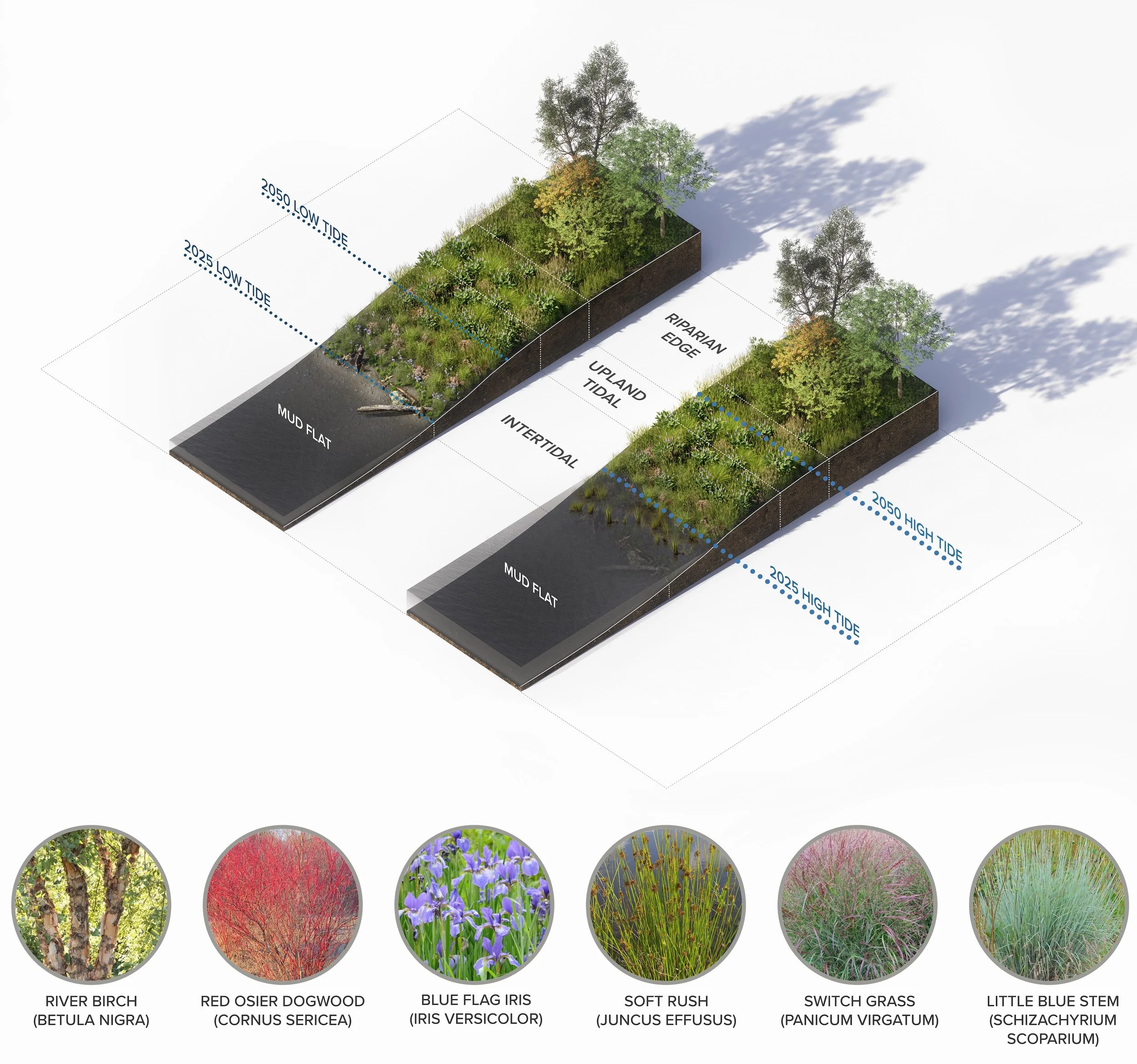 The climate-adaptive design enhances the remnant shoreline shape through the introduction of a living shoreline that will restore marsh habitat and create a resilient, accessible landscape.